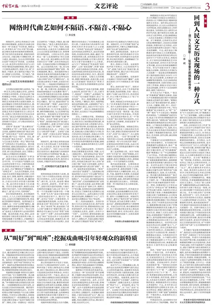 网络时代,最不能忘却的就是曲艺文化与老百姓血浓于水的真情实感。有人总结说,曲艺是“有情有趣儿,有人有事儿”。当初十分认可它的我后来却自问:难道戏剧与其他很多文学艺术样式不同样皆是“情、趣、人、事”的平衡与协调吗?此外,网络时代同样亦需要重视曲艺优秀、独有的文化传统,并随时代变化而发展创新。